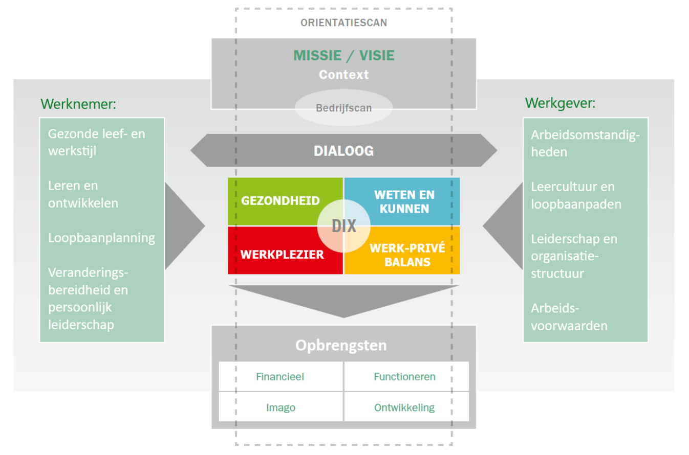 De Duurzame InzetbaarheidsindeX (DIX) van TNO is een instrument dat inzicht geeft in de duurzame inzetbaarheid van werkenden. De DIX brengt factoren zoals gezondheid, motivatie, kennis en werkomgeving in kaart. Werkgevers kunnen de DIX inzetten op organisatie-, team- en afdelingsniveau om knelpunten te signaleren, ontwikkelingen te volgen en gerichte interventies te ondersteunen. Individuele medewerkers kunnen de DIX gebruiken om hun eigen inzetbaarheid te beoordelen en persoonlijke verbeterpunten te bepalen. Door herhaalde afname wordt zichtbaar hoe duurzame inzetbaarheid zich in de tijd ontwikkelt.